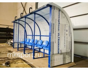 Скамейка для запасных игроков на 6 мест. Металлокаркас скамейки изготовлен из профильной трубы 40*40*2мм и 40*25*2мм. Сидения пластиковые. Материал обшивки – прозрачный сотовый поликарбонат 8мм. Покраска полимерная порошковая с предварительной покраской цинкосодержащим грунтом, цвет синий. Возможна модификация кратная 2-ум местам.
