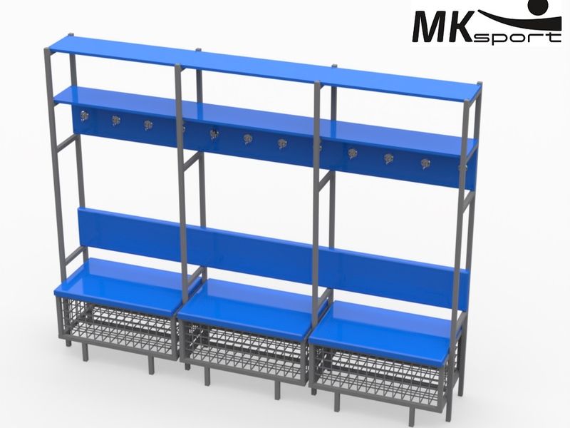 Индивидуальное место хоккеиста используется для оборудования раздевалок и предназначено для хранения инвентаря, одежды и экипировки. Каркас изделия изготовлен из профиля 25*25*2 мм. Полки, спинка и сиденье выполнены из ЛДСП 16 мм. Сиденье обшито синим кожзаменителем. Толщина сетки для короба под сиденьем – 3 мм. Стандартный цвет изделия серо-синий.